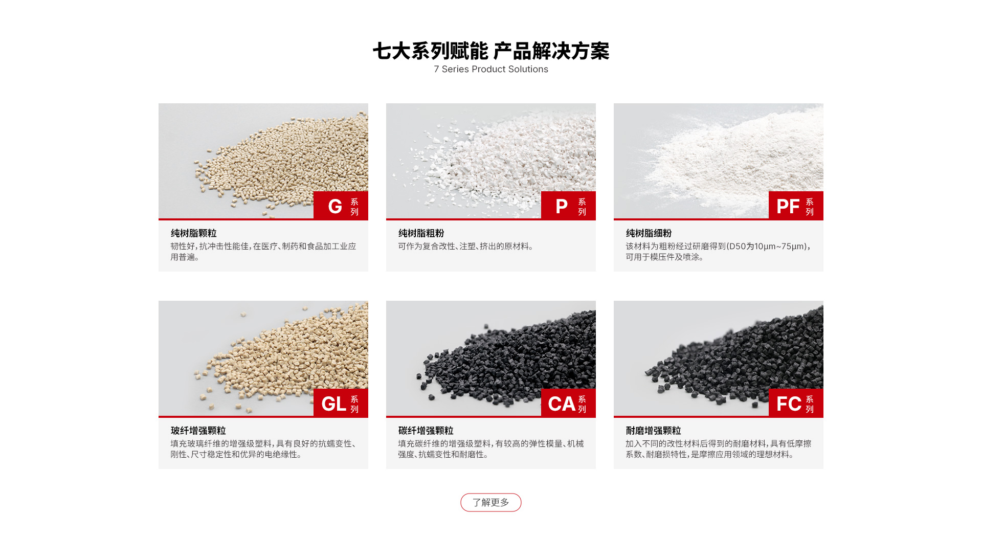 純樹脂顆粒G系列 純樹脂細粉PF系列 純樹脂粗粉P系列 玻纖增強GL系列 碳纖增強CA系列 耐磨FC系列 應用定制系列